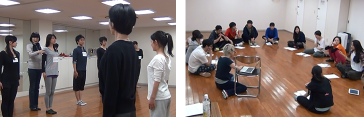 ①柔らかい身体作り、②柔らかい声作り、③スピーチ、④台本のない即興演劇
